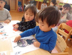 今日は、新年らしい活動をしました。絵合わせカード(ぱくぱくおにぎり🍙)で、「これどこにある?」と1枚のカードを見せると、同じおにぎり🍙の具を必死に探して見つけたり、目の前にあるカードをすぐに取って「あった❣❣」と教えてくれました。