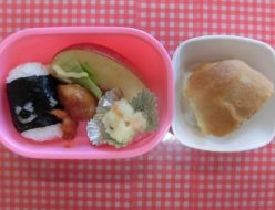今日はいいお天気になってよかったですね。給食は、鶏肉の甘酢からめでした。うさぎ組以上は空弁当に詰めました❣❣おかわりもきれいになくなりましたよ😊おやつは、子ども達に人気のビスキュイパンでした。