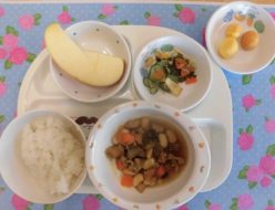 今日の給食は、野菜がいっぱいの五目煮でした。根菜を中心に干ししいたけや、昆布、鶏肉のだしがしっかりきいていて、美味しくできました。じゃこサラダは、食べやすいようにりんごを入れています。お野菜いっぱい、元気モリモリな給食でした。