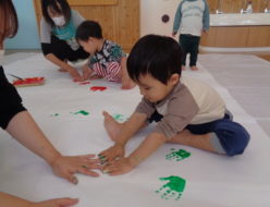 今日は、発表会の練習をした後に、製作を行いました。床に大きな広用紙を広げて、手型をつけました❣子ども達は、手✋に絵の具をつけて、用紙にぺったんと くっつける感触や、色がつく様子を興味津々で楽しんでいました。