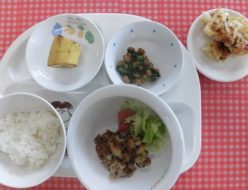 台風が近付いてきましたね。風も強いですね。給食は、初メニューの豚の胡麻焼きでした。豚肉を醬油などで漬け込み、胡麻を入れて焼き上げました!おやつは、お好み焼きでした。