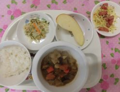 今日はいいお天気になりましたね。給食は、うま煮でした。大根や里芋、しいたけなどいろいろな野菜を入れましたよ!おやつは、ポテトとウインナーのチーズからめでした。