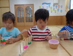 今日は、指先遊びとお絵描きをしました。指先遊びでは、小さなボンボンを指先でつかみ、ボトルに真剣に入れている姿や、ブロックを棒に通して喜ぶ姿が見られました。