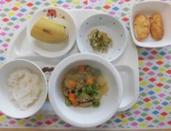 今日もいいお天気になりましたね。給食は、肉じゃがでした。みんなきれいに食べてくれました♬おやつは、ごまクッキーでした。ごまは栄養価も高いですよね。