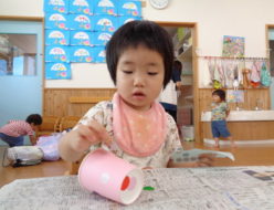 今日は、七夕飾りの製作をしました。紙コップに好きな色のシールを貼ったり、手型スタンプをしたり、最後にクレヨンで顔を描きました。紙コップにシールを貼る時に、紙コップの外側だけではなく、コップの見えない中までシールを貼っていて、とても自由な発想をする子ども達でした。