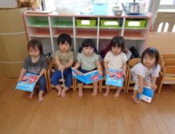 製作の後、椅子を並べて座って 7月の月間絵本を見ていたりす組さん。お兄ちゃん達みたいに、上手に座って本を広げていたので、あまりにも可愛くて 思わず写真を撮ってしまいました。午前中沢山遊んだので、疲れて早々に寝ている子もいました。