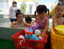 水遊びが楽しい季節❣❣うさぎ組🐇は、大きいプールに入る事をとっても楽しみに毎日過ごしています。何といっても大人気なのは、「すべり台」です。はじめは少し怖がりながら滑っていましたが、段々と慣れてきて、自分達で"ジャポーン❣”と滑る子が多くなってきました。