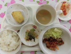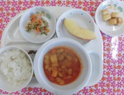 今朝は霧がすごかったですね。日差しも出てとっても暖かく、半袖になっている子もいたようですね。給食はポークビーンズでした。大豆を煮て、柔らかくして、トマト缶とケチャップで煮込みました。おやつは、お麩のラスクでした。