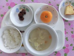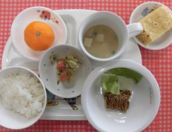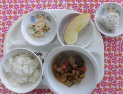 今日は昨日に比べて暖かく、子ども達も外で元気に遊んでいましたね!給食は、大豆の五目煮でした。蓮根、竹輪、こんにゃく、人参、ごぼう昆布も前日から戻した出汁も使いました!おやつは、おにぎり🍙でした。