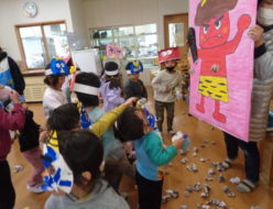 今日は、節分で、うさぎ組以上はランチルームに集合して節分の由来や、お話しを聞きました。「鬼の嫁さん」というお話しでは、煎った豆を撒くこと、撒くときのかけ声等はどうして始まったか?の内容が知らせてあり、子ども達は真剣に見ていました。その後、色々な節分の由来を教えてもらいました。
