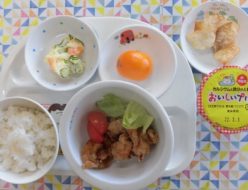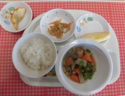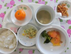 今日も天気が良かったですね。今日の給食は人参、椎茸、ごぼう、筍、蓮根など栄養満点のお野菜がはいった筑前煮でした。色んなだしがでて美味しかったです。おやつは、園でとれたさつまいもを使いました。