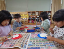 今日は、1月の製作で、だるまを作りました。お手本をしっかり見ながら、「どこに付けようかな?」と友達とお話しながら、だるまの顔をのりで上手に付けていました。怒っているだるまや、困り顔のだるまなど、可愛いだるまが沢山出来ました。