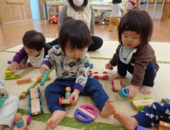 今日は、節分で使用する鬼のお面作りをしました。紙皿を一人一枚取り、絵の具の「赤・青」好きな方をハケを使い塗っていきました。ダイナミックに塗り始める子もいれば、端っこから丁寧に塗り始める子もいて様々でした。手に絵の具が付かない様に工夫している子もいて、面白かったです。