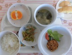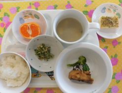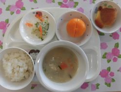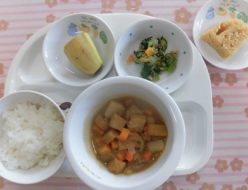 また寒くなりましたが、日差しが暖かく感じましたね。明日も寒くなりそうですね。給食は、豚汁でした。いろんな具材を入れました。からだは温まったかな?おやつは、ビスキュイパンでした。