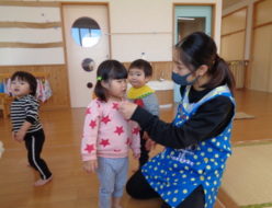 今日は、おやつを食べた後 部屋で発表会の「お弁当バス🍱」の練習をしました。背景の後ろに座って、出番を待って「おにぎりさん🍙」「いちごさん🍓」「ブロッコリーさん🥦」と呼ばれると中央に出ていき、名前を呼ばれると「ハイ」と返事をして手を挙げてくれました。