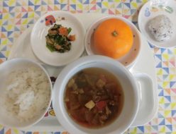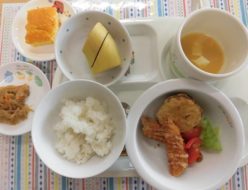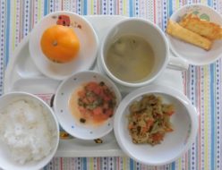 今日は少し日差しがあり、過ごしやすかったですね!給食は、けんちん汁でした。大根や人参、里芋などいろいろな野菜を入れました。里芋は園の畑でとれたものを使用しました。おやつは、おにぎり🍙でした。