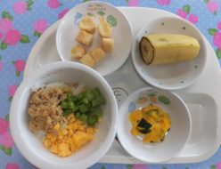 今日も暖かくなりましたね。給食は、三色丼でした。おやつは、お麩のラスクでした。サクサクした食感でおいしく仕上がりました。明日はお誕生日会ですね。