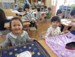 今日も、子ども達は外で元気よく遊んでいましたね。給食は、親子丼でした。おやつは、ふかし芋でした。くま、きりん組さんが頑張って掘ってきてくれたいもを使いました。