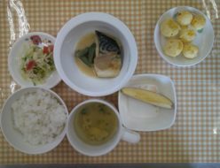 今日は、暑くなりましたね。給食は、トンカツでした。豚ロースに衣をつけて、揚げましたよ❣おやつは、フルーツヨーグルトでした。バナナやみかん缶、りんごをいれました。
