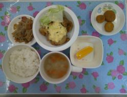 朝晩はまだまだ冷え込みますね。給食は、きりん組さんリクエストメニューのチキン南蛮でした。おかわりしてくれる子もいましたよ!副菜は蓮根の金平でした。蓮根と人参、こんにゃくを炒めました。おやつは、黄粉団子でした。
