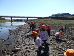 今日は、朝からいいお天気でしたね。園庭で遊んだ後は、牛舎方面へお散歩に行きました。牛舎に着き、「牛🐄さ~ん。出ておいで~」とぱんだ🐼組さんが呼ぶと、中から出てきて近くまで来てくれ、大興奮の子ども達でした。帰りに河原に下りて、石投げや石探しをして遊びました。