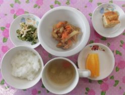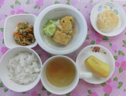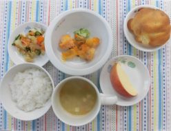 今日から雨がつづきますね。気温も低くなりました。給食は、魚のもみじ焼きでした。人参を細かくしてマヨネーズと混ぜ、魚の上にのせて焼き上げました!おやつは、ビスキュイパンでした。