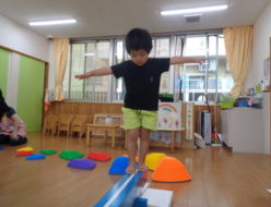 今日のうさぎ組🐇さんは、運動遊びをしています。自分の名前を、大きな声で言ってスタート🌟デコボコの山を落ちないように進み、平均台では かに🦀さん歩きではなく、足を前に出して進んでいきました。中には、怖い!!💦と泣いちゃう子も・・・。