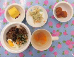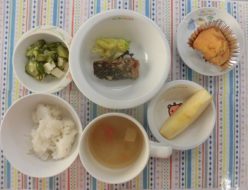 今日も暑くなりましたね。給食は、うま煮でした。大根や人参、里芋などいろいろな野菜をいれましたよ。副菜のトマトサラダは、きゅうり、トマト、チーズを入れました。苦手な子が多かったようです。