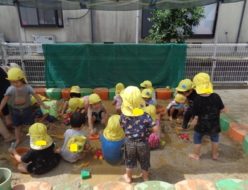 昨日から、子ども達にも話をしていましたが、泥んこ遊びをしました。砂場に水を入れて、始めは足で砂の上を歩いていましたが、だんだんと水の中に足を入れて、そのうちバシャバシャ始めて・・・。やり始めると、楽しくてたまらないといった様子でした。