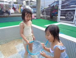 今日は絵本の貸し出しをした後、プールで沢山遊びました。水に慣れてきたみたいで、顔をつけたりもぐったりビショビショになるほど楽しんでいます♪その後、コーナー遊びで色々な玩具で遊んでいます。