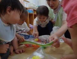 手作りウォーターマットで、感触遊びをしました。触ってみると、チャポン チャポン・・・。水が揺れて、不思議な感触・・・。中に入っている魚の玩具にも、興味津々の子ども達でした。午前睡後、なかなか目が覚めない子も、マットの上が気持ちよくて思わず寝入ってしまう姿もありました。
