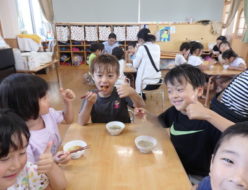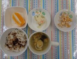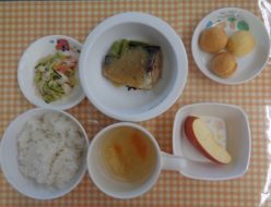 今日はとってもいいお天気になりましたね。給食は、魚の味噌煮でした。保育園の手作り味噌で麦味噌と米味噌を合わせて作りました!おやつは、かぼちゃボーロでした。