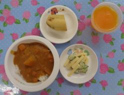 今日は、☂もあがり良かったですね。給食は、すり身のコーン揚げでした。玉葱や人参、ごぼうなどをみじん切りにして混ぜて揚げました!おやつは、ポンデケージョでした。