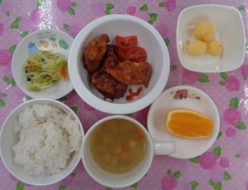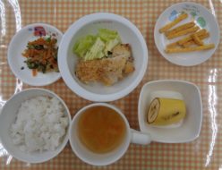 今週も☂が続きそうですね。給食は、鶏肉の香草焼きでした。鶏肉にマヨネーズとパン粉、パセリを混ぜて焼き上げました!おやつは、人参プリッツでした。