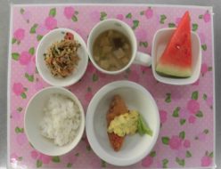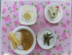 今日は、とても天気が良かったですね。給食は皆大好きメンチカツ!キャベツが沢山入ってサクサク食感の皆大好きメニューでした。おやつは、ミネラルが沢山のひじきが入った、おにぎりでした。