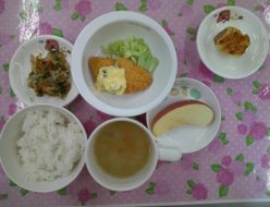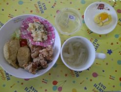 今日はお日様がでて暖かかったですね。給食は、タイピーエンでした。キャベツや人参、筍などをいれました!副菜はさつま芋サラダでした。さつま芋が甘くおいしかったですよ!おやつは、フルーツ白玉でした。さっぱり食べることができました。