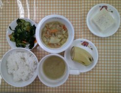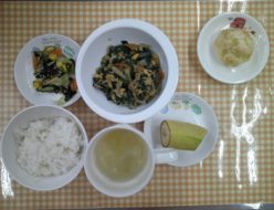今日は朝は天気が良かったですが、午後から雨でしたね。給食は、豚肉と卵の炒め物でした。玉ねぎや人参にしめじ、ほうれん草を入れて炒り卵と合わせました。おやつは、メロンパンでした。
