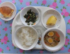 今日はどんよりくもり空で肌寒い日したね。今日の給食は具材がいっぱいの中華丼でした。好き嫌いなく、いっぱい食べてくれました♬おやつは、子ども達人気の甘い黄粉であえたマカロニあべ川でした。
