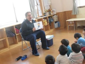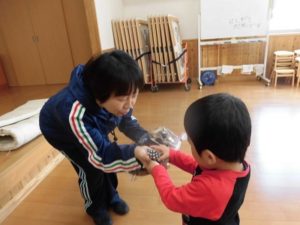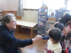 勤労感謝の日を前に、英会話でお世話になっているサイモン先生にりす組さん代表、体操教室でお世話になっている坂田先生に、
