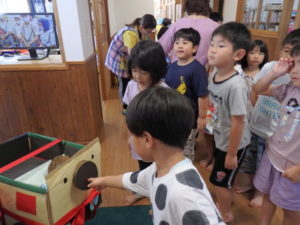 手作りのおもちゃを年長児さん(きりん組)に優しく手渡し優しい言葉をかけてくれてきりんさんたちも