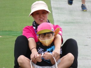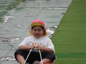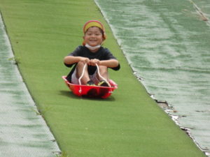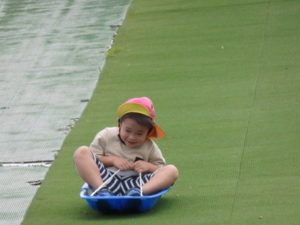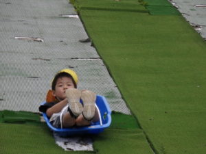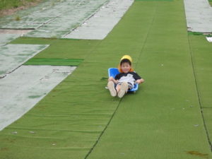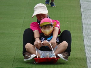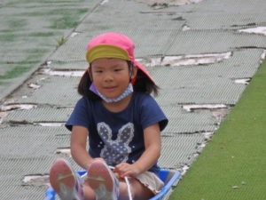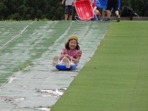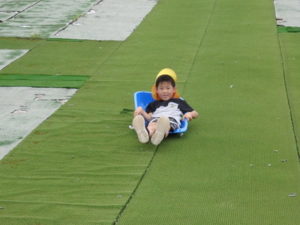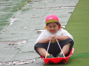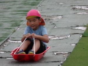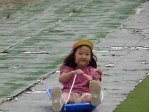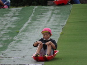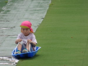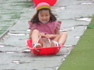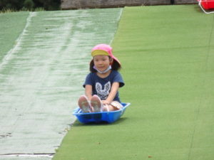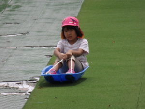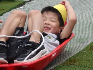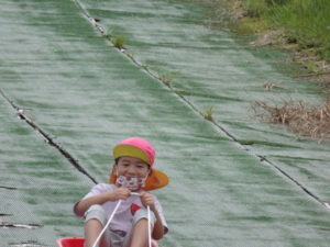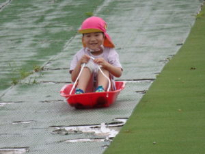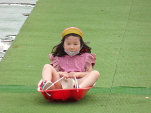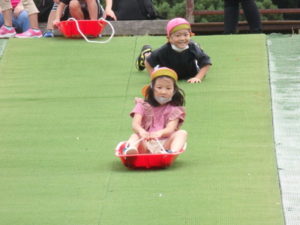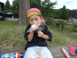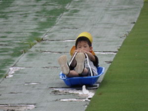 湧水トンネルから、月廻り公園へ移動し、ここで、昼食となりました。おうちから持って来たおにぎりと、途中で保育園から買ってもらった唐揚げを美味しそうに食べ、さあ、遊ぶぞ~の時に遠くの山が白くなりくもが降りてきてミスト状の雨が降ってきました。雨宿りしながら「雨止んで~」と大声で叫んでいると不思議と10分くらいで止み、お待ちかねのソリ滑りや、広場での散策を始め、ソリ滑りではバランスを崩し怪我する子どもが続出しました。痛かったけど楽しい思い出となりました。