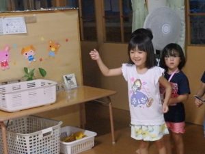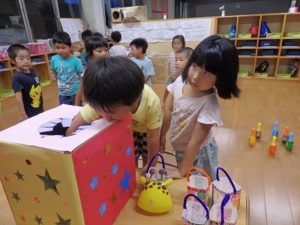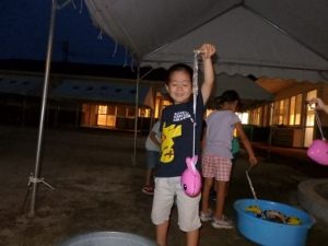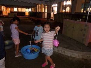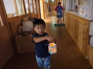 手作りランタンを持って、保育園の中を探検し、ヨーヨー釣りをしたり、