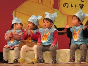 ひよこ組の生活遊び、りす組の劇、遊戯うさぎ組の劇、合奏、歌、ぱんだ組の劇、合奏