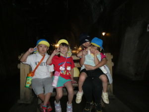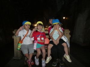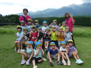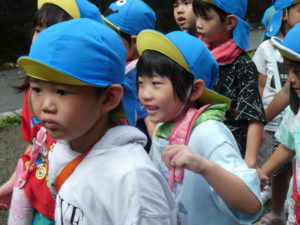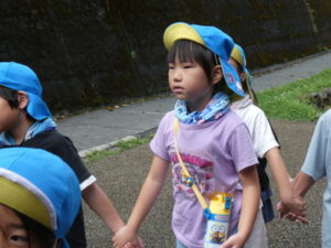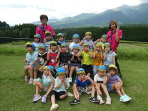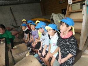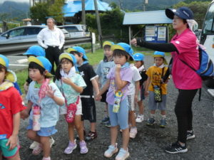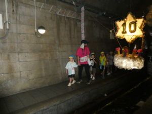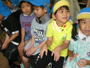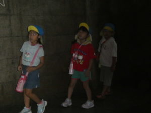 目的地はまず、高森の湧水トンネルへ行きました。入り口になるととても涼しく、「寒~い」という声も聞かれました。恐る恐るのようにして入っていくと七夕飾りがたくさん飾ってあり、「きれい~」や「すごいね~」と言い、更にその奥に行くと「ウォーターパール」がありまたまた不思議な光景が目の前に現れ、子ども達は「うわぁ~」と歓声を上げ下に降りたり、上に上がったりする水の玉をジーッと見ていました。その後は高森だよりという高森についてのクイズもあり真剣に大型ビジョンを見て楽しみました。トンネルを出る際、「きれいだったね~」と男の子が感想を言い、ウォーターパールの事を言っているようですが、名前が難しいので、「ウォーターパールだよ」と教えると、「帰ってから、かーちゃんに言わなんけん」と、ずっと「ウォーターパール、ウォーターパール・・・」と呪文のように唱えていました。お母さんにきれいだった事を伝えたかったようです。
