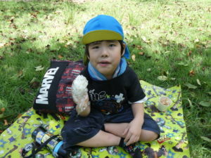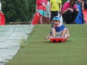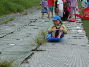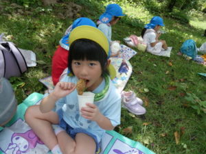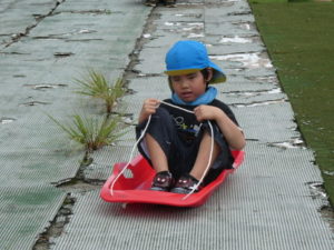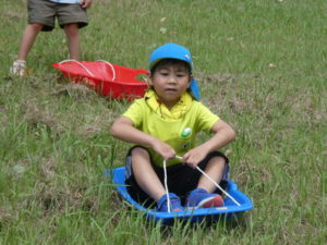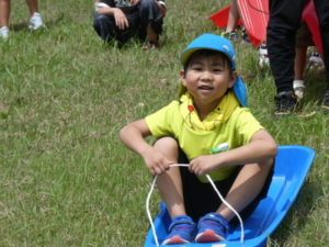 その後、月廻り公園へ移動し、お昼ご飯を食べました。途中で買ってもらったから揚げと持ってきたおにぎりをみんなおいしそうに食べ、唐揚げはおかわりする子どももいました。月廻り公園は草スキーも出来持ってきたソリを使って滑ろうとしますが、あまりに勢いがよすぎて、転んでしまう子どももいたので、コースの途中から滑らせました。それでもスピードは上がり「楽しい~」という子どもと「怖かった~」という子どもの両方の感想がありました。