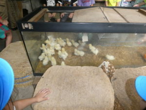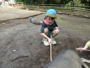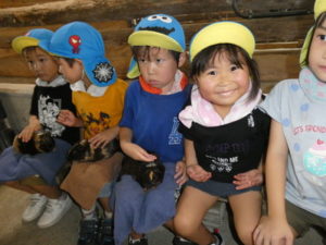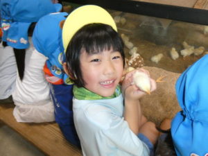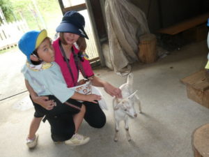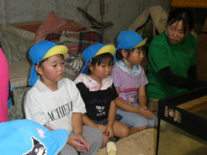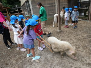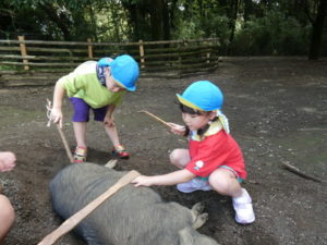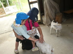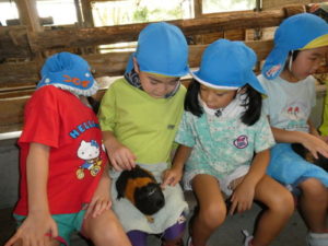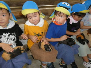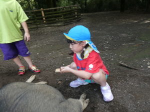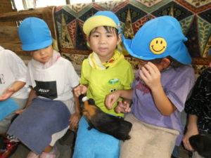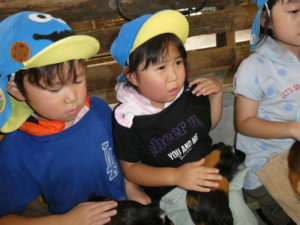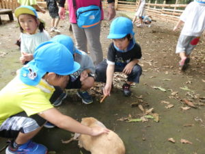 次に向かったのは、南阿蘇触れ合い動物園で、やぎ、いぬ、モルモット、ひよこ、かめ、フラミンゴ等たくさんの動物がいて、子ども達は目をキラキラさせて早速、子ヤギをなでなでしていました。生まれて10日目のひよこもいて抱っこさせてもらったり、餌を上げたりしました。モルモットは膝の上に置いてもらい、ジーッと座っているので「かわいい~」とこれもなでなでして嬉しそうな笑顔が見られました。広場に移動し、ここでは、大きなカメ、ぶた、うさぎ、等を飼育されていてうさぎに人参を食べさせたり、孫の手を使って豚のお腹をかきかきしたりと色んな方法で触れ合っていました。
