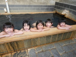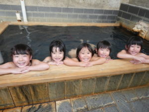 南阿蘇触れ合い動物園を後にして、バス旅行最後は「汽車ポッポ温泉」へと向かいました。「汽車ポッポ温泉」では、4つのお風呂に分かれて友だちと一緒に入りました。掛け湯をして入ると、ちょっとぬるめにしてあったのでみんな「気持ちいい~」とはしゃいで中には泳いでいる子どももいました。