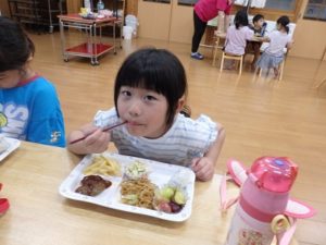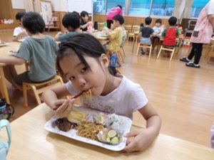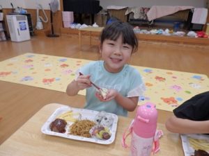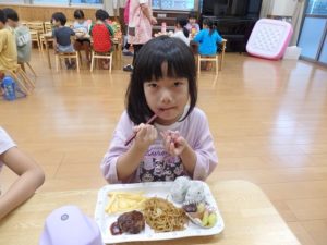 こうして1日目のバス旅行が終わり保育園に帰ってきました。ちょっと休憩で映画館雰囲気のDVDを見て、早めの夕食で給食の先生方がお子様ランチを作ってくださっていて、みんなおいしそうに食べました。