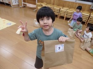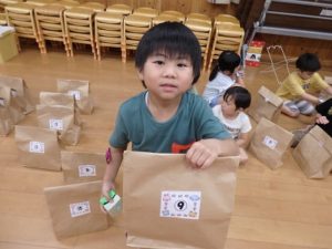 その後は夜のお楽しみ、宝探しゲームです。夜の保育園で宝物を探しまわり、見つけると「あったー」と宝物を見つけて喜ぶ姿が見られました。見つけた宝物を広げて見せやっこしていました。