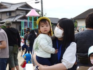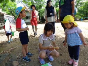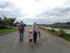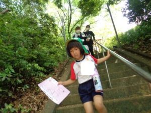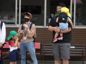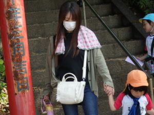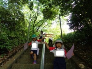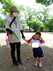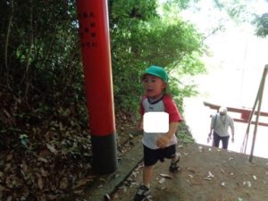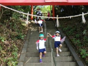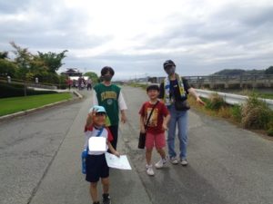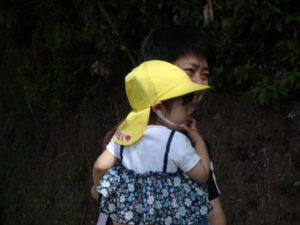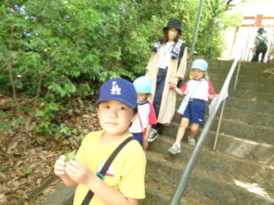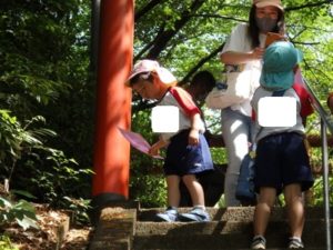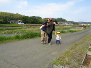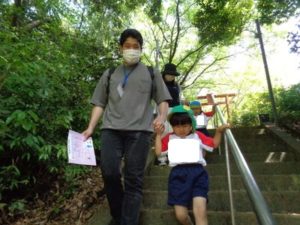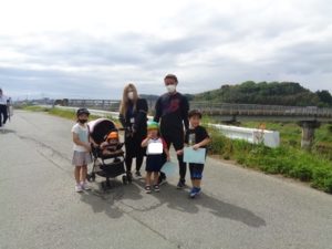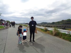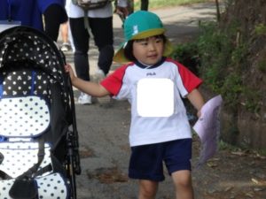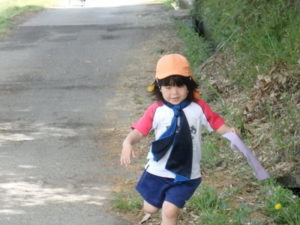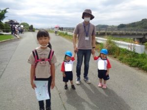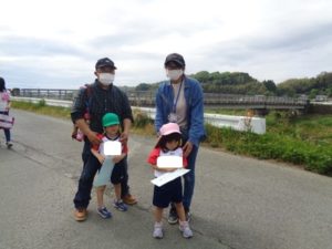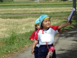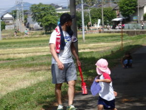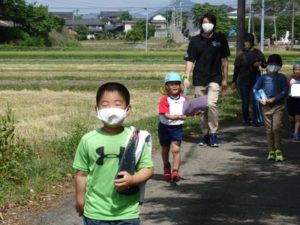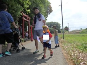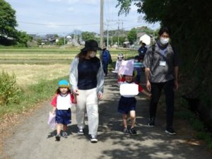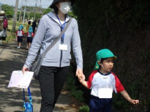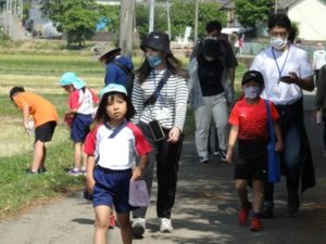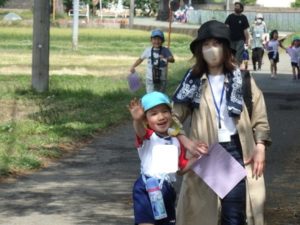 Aコースは、岡のお稲荷さんまでの往復約2.7㎞、Bコースは、田島一区の菅原神社までの約2㎞、Cコースは、河川敷沿いを歩き牛舎までの約1.8㎞の道のりで、親子、兄弟、友だち同士、家族で歩き、時々草花を手に取ったり、ピーピー草を発見してお父さんが鳴らしているのを子ども達が感心して見ていたりと、ほのぼのする光景も見られました。園児はいつもの散歩コースで日頃から鍛られていてさっさと歩いている姿を見て保護者からは「凄い!こんなに歩いているんですか?」の声が聞かれました。卒園児も多く参加してくれ、「懐かしい~ここ、こんなに狭かったっけ?」「また、ここに散歩に来たい」と言って楽しんでくれる姿も見られました。
